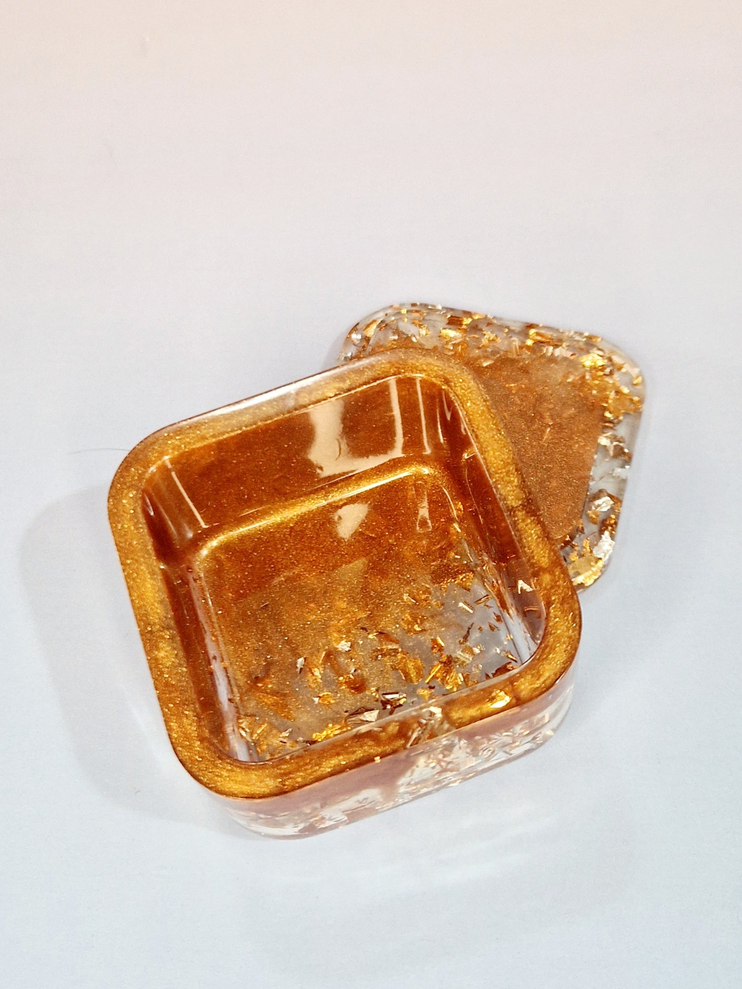 Caixa decorativa em resina com acabamento brilhante e aplicação de folhas de cobre, criando um efeito elegante, luminoso e artesanal. O design quadrado com tampa transparente decorada torna esta peça perfeita para guardar pequenas bijuterias, acessórios ou elementos decorativos, ao mesmo tempo que acrescenta um toque sofisticado a mesas, aparadores ou penteadeiras. Um modelo único que combina funcionalidade e decoração.