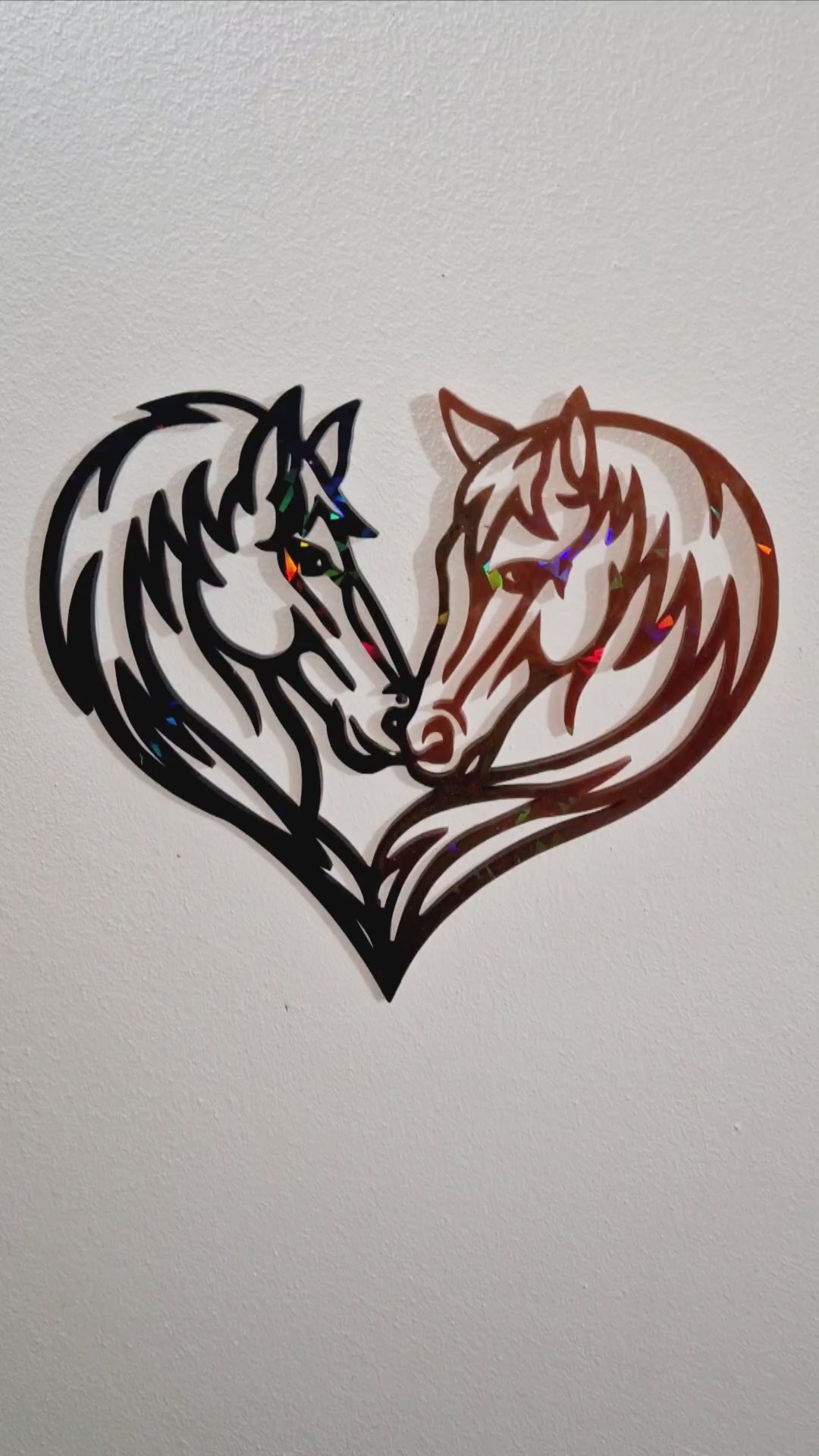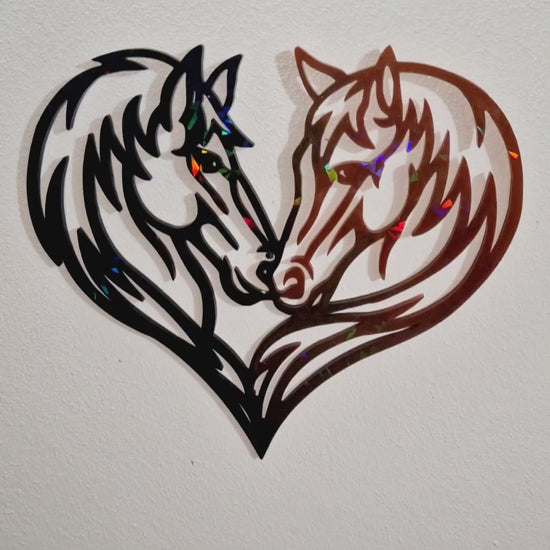 Decoração de parede em resina epóxi representando dois cavalos unidos num coração, símbolo de ligação, confiança e harmonia. As linhas suaves realçam a expressão dos cavalos e captam a sua beleza natural, tornando esta peça especialmente apreciada por quem vive e sente o mundo equestre. O efeito holográfico da resina adiciona brilho e jogos de luz, criando reflexos que dão vida à peça conforme o ambiente.