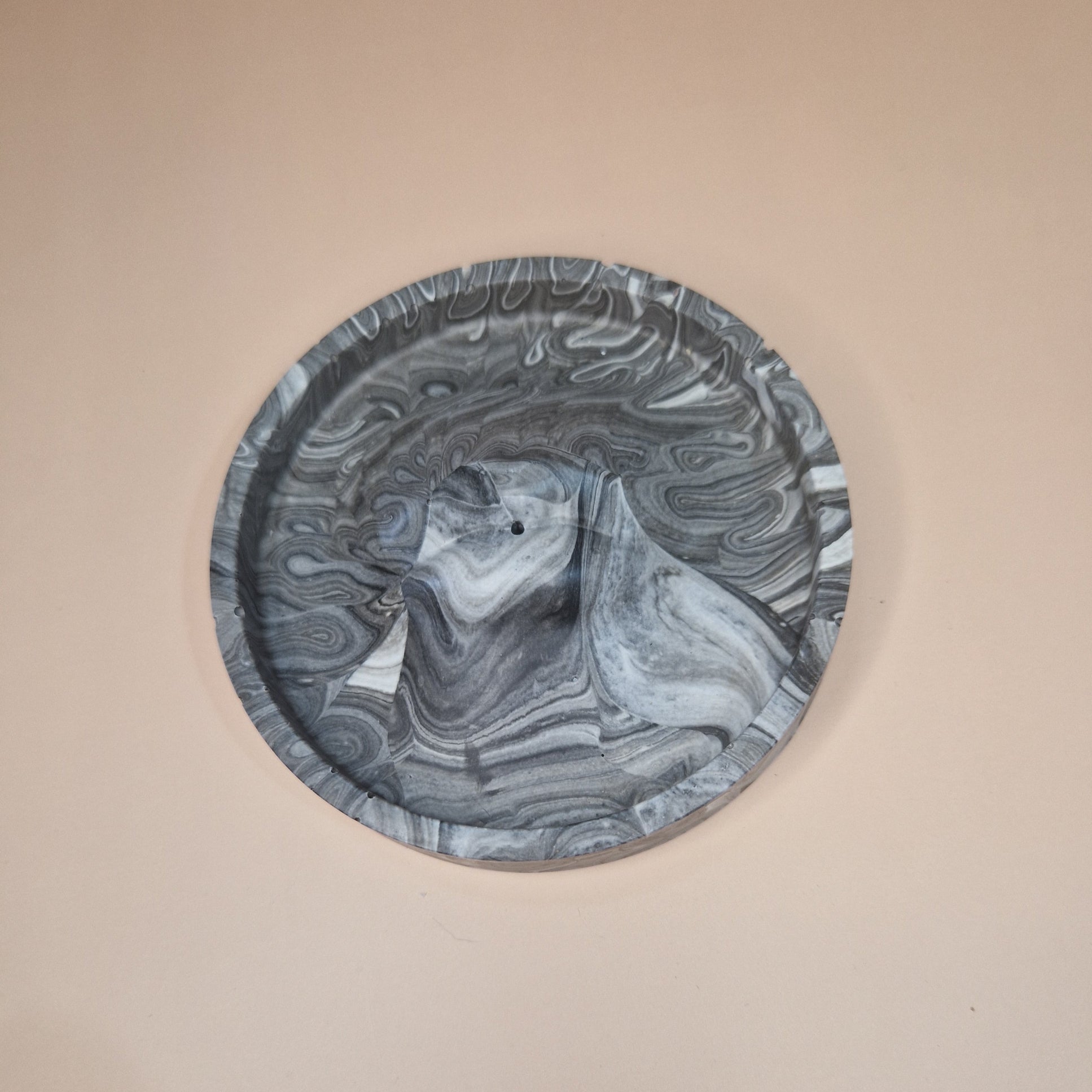 Feito em jesmonite marmoreada em tons de cinza, este suporte circular destaca-se pelo seu relevo em forma de boca, que confere um toque artístico e contemporâneo. A peça é ideal para varetas de incenso, mas também pode ser usada como prato decorativo para joias, velas ou pequenos objetos.