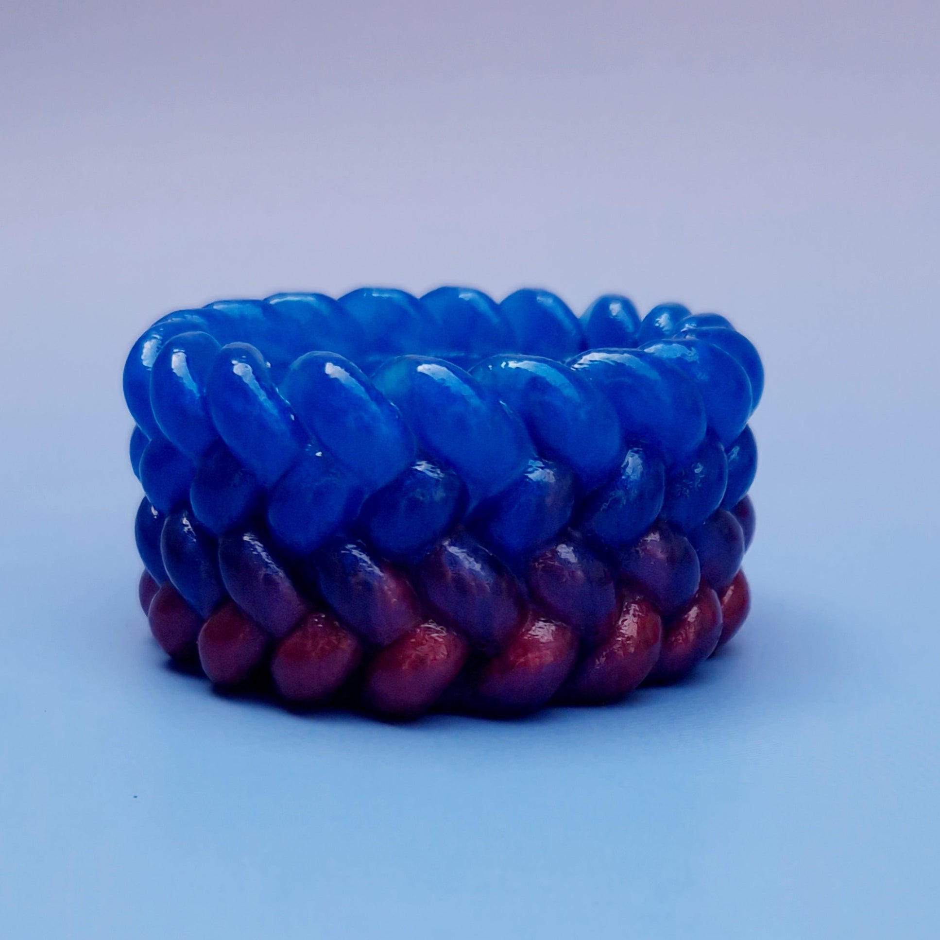 Este suporte de vela artesanal combina elegância e originalidade com seu design trançado em degradê de azul intenso e vinho profundo.