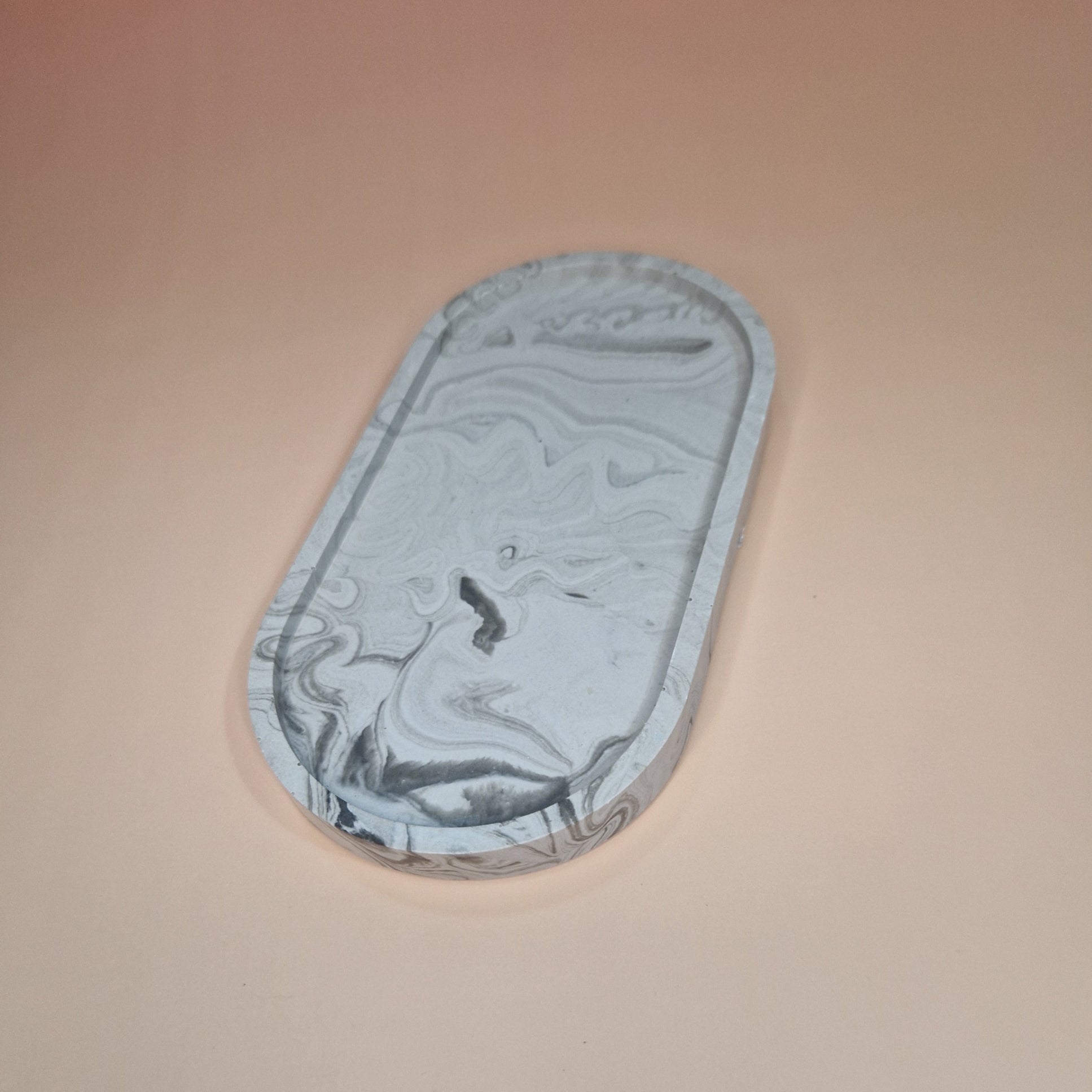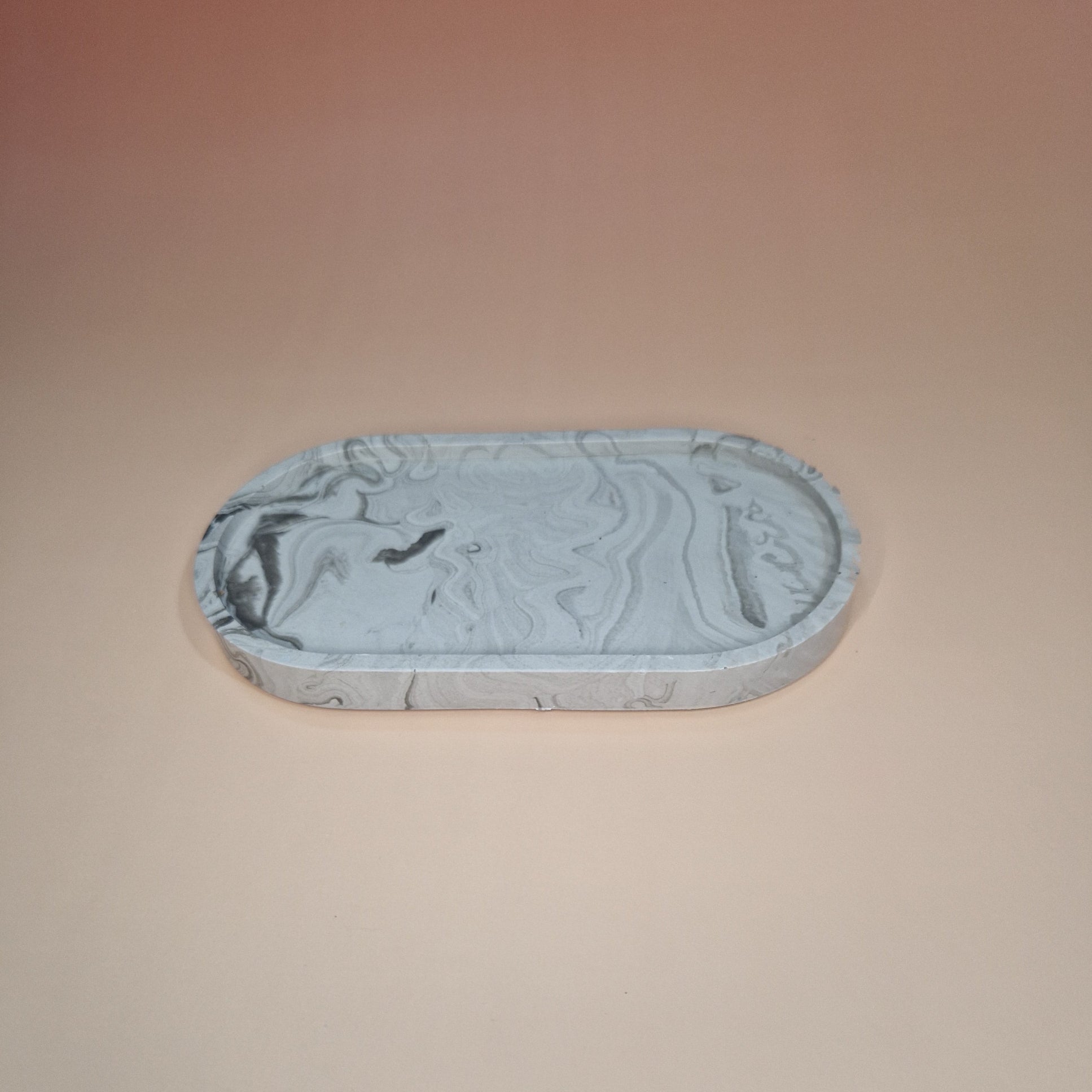 Com um charme atemporal e toque artesanal, esta bandeja em jesmonite marmorizada exibe veios delicados em tons de cinza e branco, que se misturam de forma orgânica, lembrando o mármore natural.